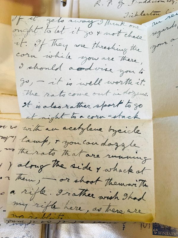 I have bought one of those big cage-rat traps. This place is over-run with rats. It is rather good sport to catch a rat, & then let it out & shoot at it as it runs. If it gets away I think one ought to let it go & not chase it. If they are threshing the corn while you are there, I should advise you to go,—it is well worth it. The rats come out in dozens. It is also rather sport to go at night to a corn-stack with an acetylene bycicle (sic) lamp, & you can dazzle the rats that are running along the side & whack at them,—or shoot them with a rifle. I rather wish I had my rifle here, as there are no rabbits.