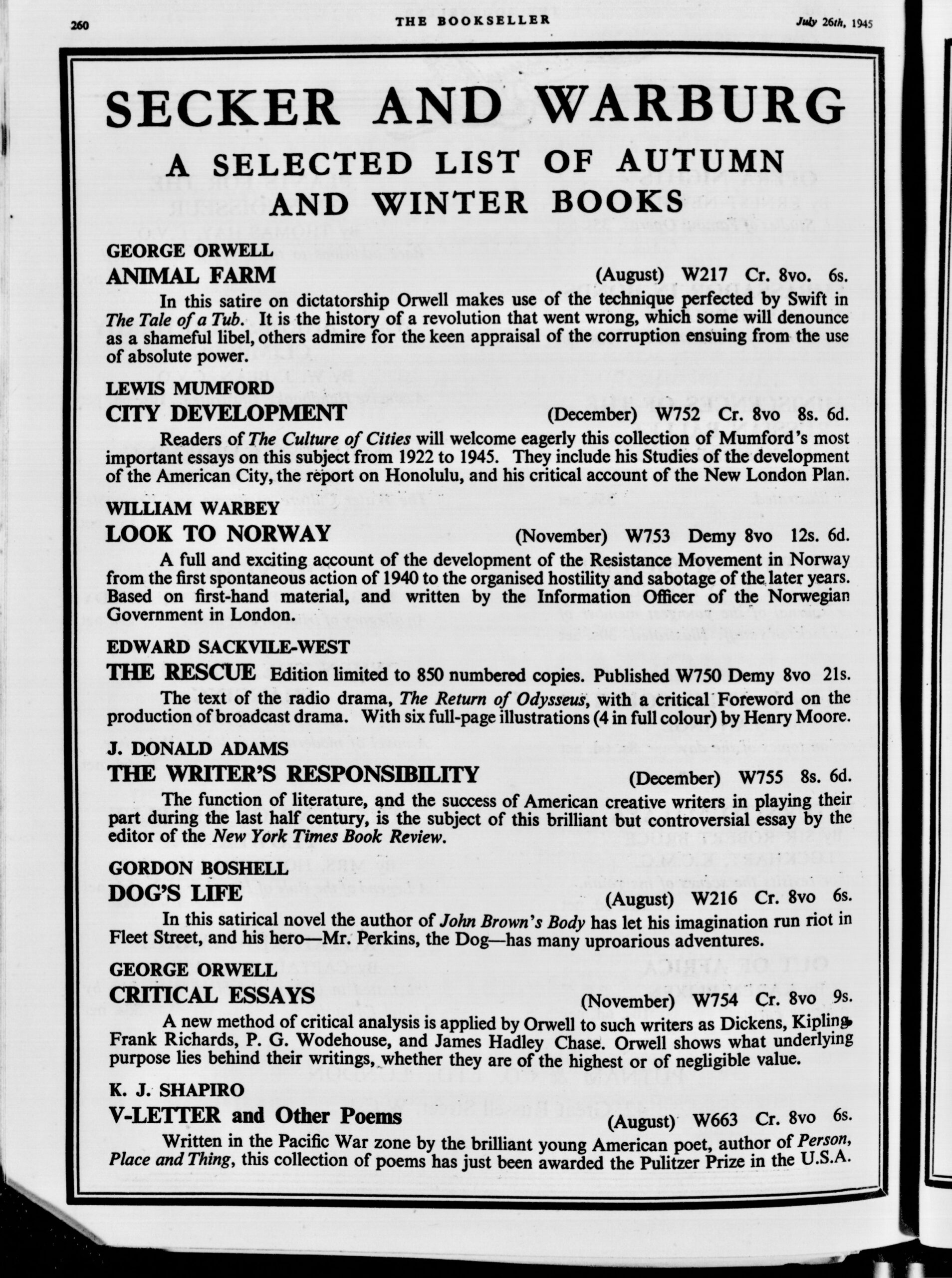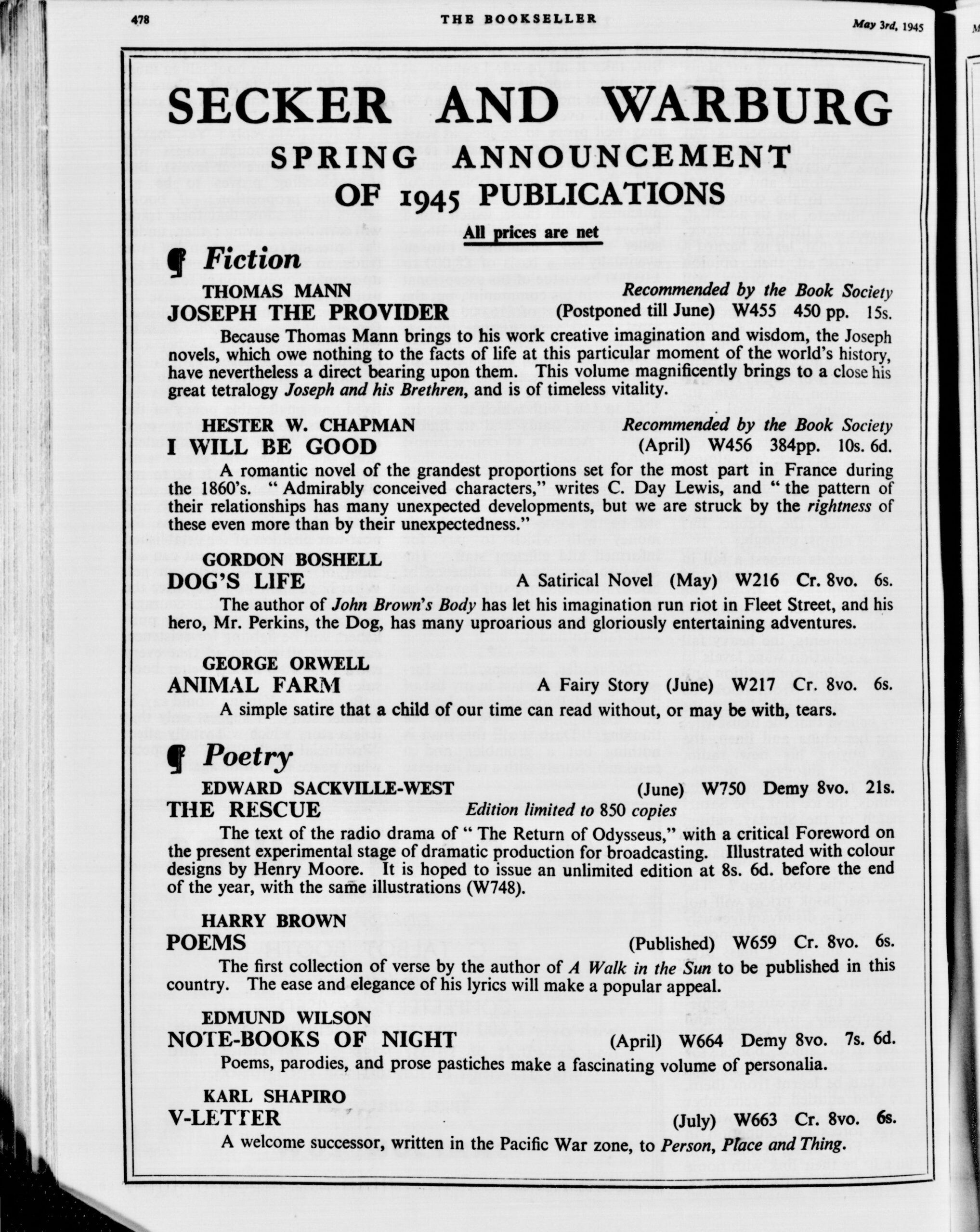 On the 3rd May 1945, Secker & Warburg originally advertised in The Bookseller that Animal Farm would be published in June. Their next advert, on 26th July, announced the imminent release of Animal Farm and Critical Essays (which was delayed until the following year).