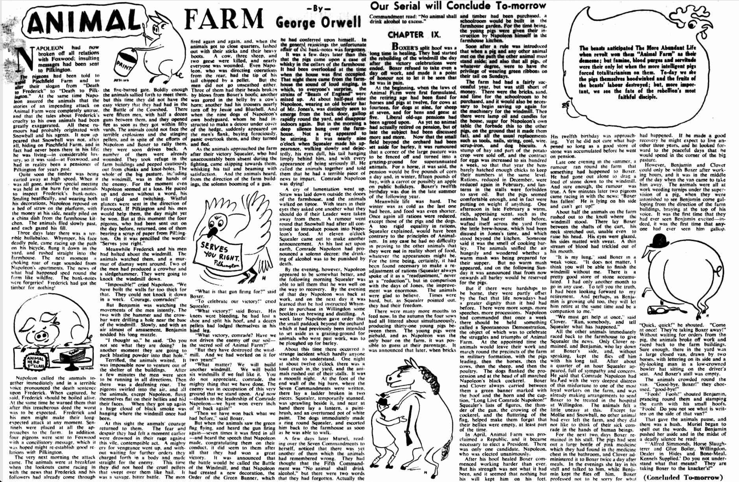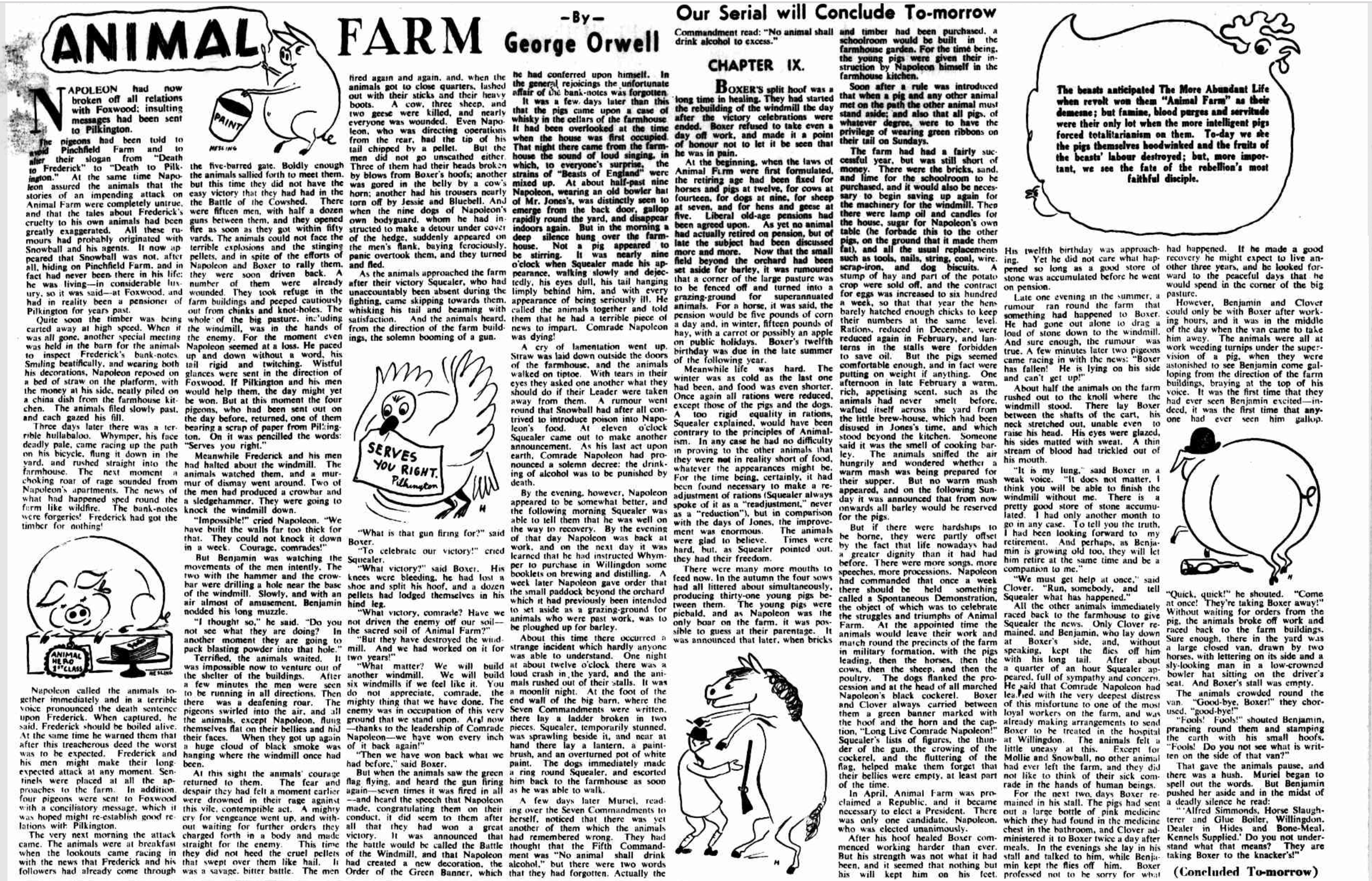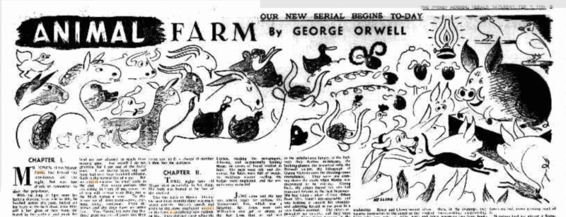 Animal Farm was published in the Sydney Morning Herald on 9, 11, 12, 13, 14, and 15 February 1946. Orwell wrote to his agent, after being sent press cuttings remarkably quickly. It is easy to see why he was not overly enthusiastic about the illustrations by Bernard Hesling (1905-1987) being used in a future edition of the novel, although he does say he thinks “they are quite good”: