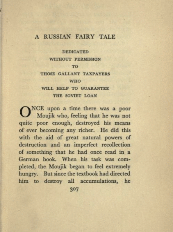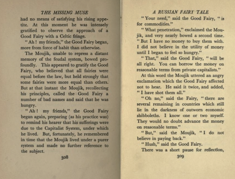“The Moujik, unable to repress a distant memory of the feudal system, bowed profoundly. This appeared to gratify the Good Fairy, who believed that all fairies were equal before the law, but held strongly that some fairies were more equal than others. But at that instant the Moujik, recollecting his principles, called the Good Fairy a number of bad names…”.