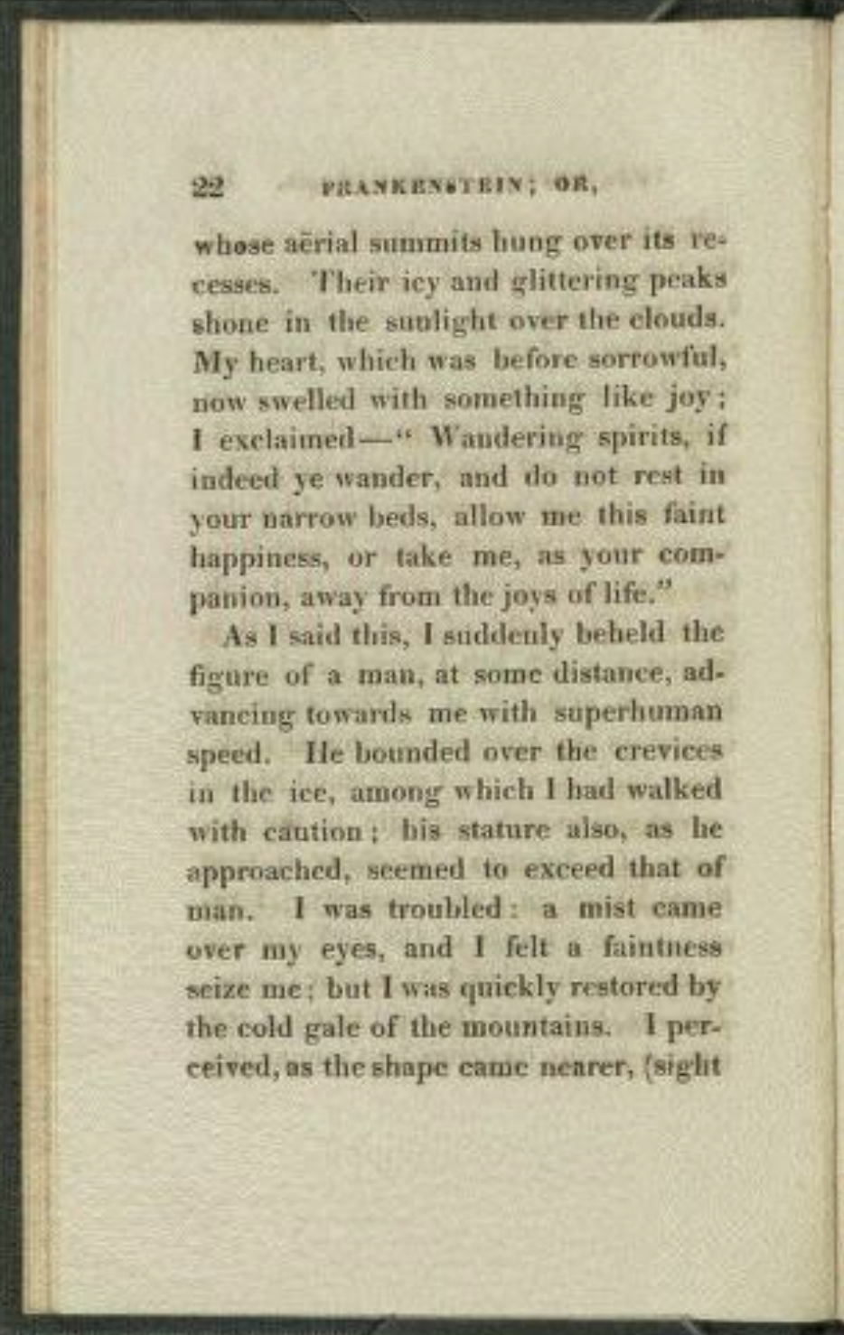 “Hear my tale; it is long and strange, and the temperature of this place is not fitting to your fine sensations; come to the hut upon the mountain. The sun is yet high in the heavens; before it descends to hide itself behind yon snowy precipices, and illuminate another world, you will have heard my story, and can decide…”