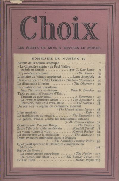 Twelve issues of Choix – Les Écrits Du Mois A Travers Le Monde were printed by The Fleet Street Press during 1944-45 for distribution in newly-liberated France. Edited by Graham Green and Antonia White, T.S. Eliot, W.H. Auden and Ernest Hemingway appear in the journal’s first issue. Symbolically, Liberté, Paul Éluard ‘s poem, graces the opening page.
